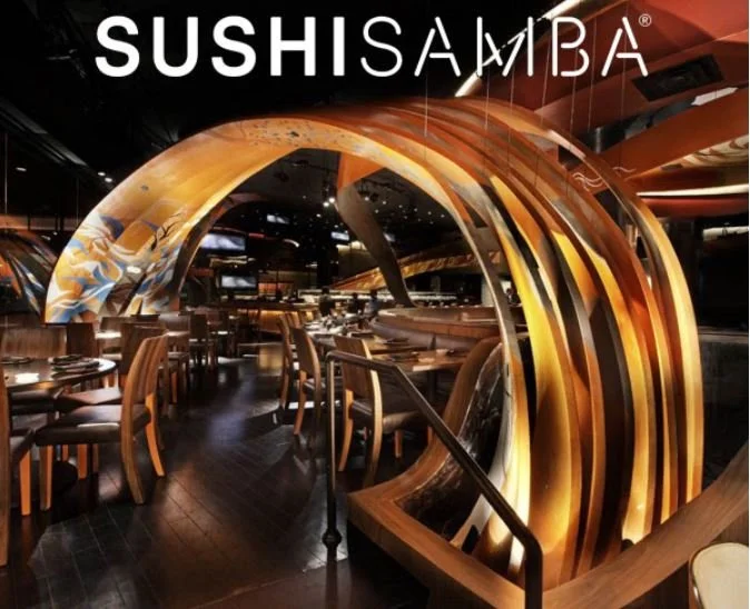 Located in The Grand Canal Shoppes at The Palazzo, SUSHISAMBA Las Vegas was designed by ICRAVE, an award-winning design firm with deep roots in the hospitality industry. Guests are greeted by an architectural glass façade inspired by Mondrian in its linearity, color, and sharp edges. Dramatic 16-foot ceilings create a soaring atrium that houses the main restaurant space: a vibrant, Carnaval inspired environment that mirrors the energy of the Las Vegas Strip beyond its doors. The area is anchored by an oversized art installation, a three-dimensional illustration through space of swirling “ribbons” that explode from the center of the room and wrap their way around eating spaces, winding around the sushi bar and lounge, and evoking a feeling of movement and dynamism. Artful projections move continuously throughout the space on scrims and walls, with visuals featuring the colors, flavors, and cultures of Japan, Brazil, and Peru.
